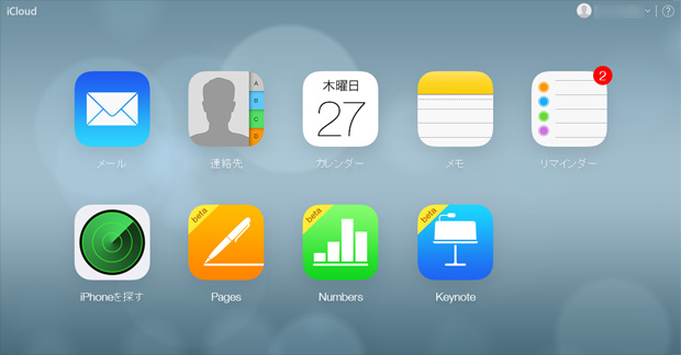 メール、連絡先、カレンダー、メモ、リマインダー、がを探す、そしてbeta版ですがPages、Numbers、Keynoteを管理できます。